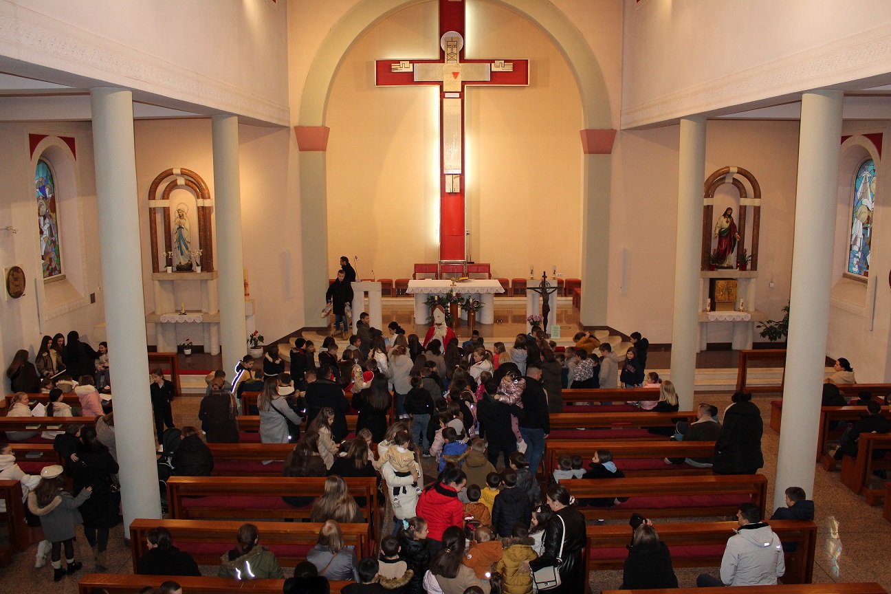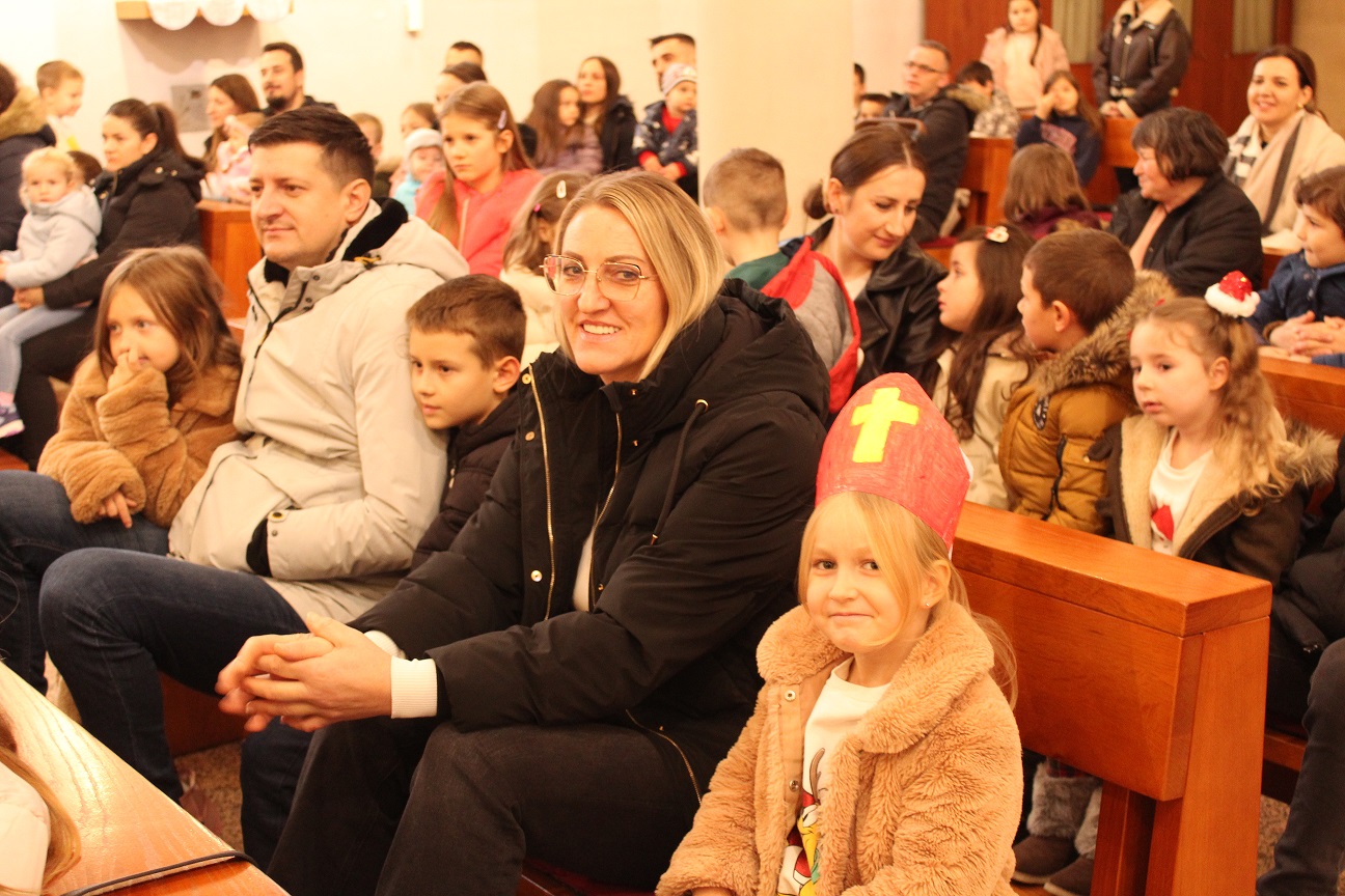 Nakon pozdrava župnog vikara vlč. Dine Mustafija, članovi župnog zbora mladih predvođeni s. Anđelinom Perić, SMI, pjesmom su dočekali Svetoga Nikolu koji je u pratnji ministranata ušao u crkvu i obratio se nazočnima. Potom je omiljeni dječji svetac uz pomoć mladih podijelio toliko iščekivane darove.