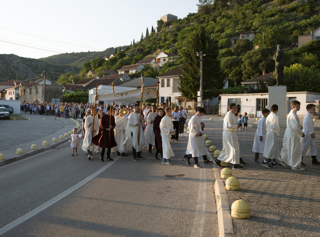 Velika masa svijeta ispunila je stolačke ulice, a procesija se dostojanstveno i pobožno kretala gradom uz pratnju župnih redara. Na četiri stajališta-oltara: Podgrad, Kolodvor, Centar i Trg Sv. Ilije, župnik je obavio blagoslov na sve četiri strane svijeta. Kad je procesija došla na Centar grada, gradska su zvona pozdravila procesiju i Presveti Oltarski Sakramenat.