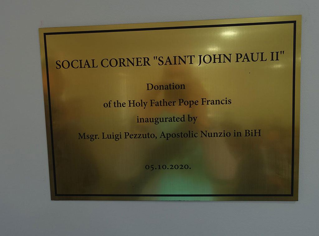Potom je u prostoru Službe socijalne animacije upriličeno simbolično prosijecanje svečane vrpce i otkrivanje memorijalne ploče posvećene sv. papi Ivanu Pavlu II. koji je dva puta posjetio Bosnu i Hercegovinu.