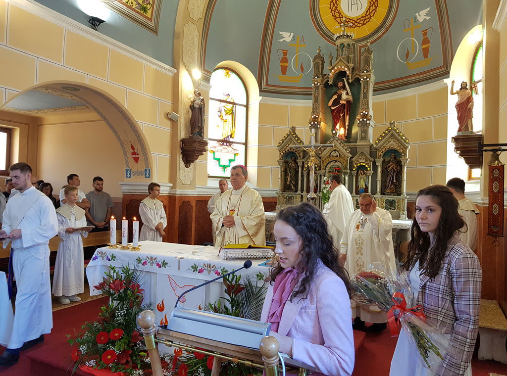 Potom je govorio i o djelovanju Duha Svetoga na živu zajednicu od početaka Crkve. "Sve po Duhu djeluje, jednako kako ćemo danas svojim rukama zazvati Duha Svetoga da siđe nad ove krizmanike, da svih sedam rukavaca velike rijeke nebeske rose spusti u njihov živote, kako bi mogli biti blagoslov sebi, župnoj zajednici i obiteljima", rekao je na kraju svoje propovijedi mons. Vukšić.