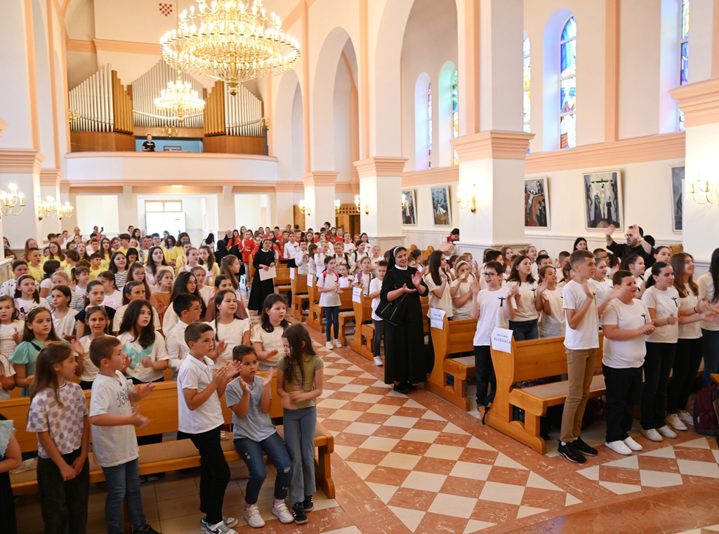 Središnja tema smotre bila je Mira Tvog da budem glas, a sudjelovalo je sedam zborova s oko 250 djece. Svečanom procesijom oko crkve započela je euharistija koju je slavio župnik fra Josip Mihael Matijanić. U svojoj jednostavnoj i mladima prilagođenoj propovijedi fra Josip je podsjetio na važnost pjevanja, ali i skladnog pjevanja. "Tko pjeva, dvostruko moli, tko dobro pjeva trostruko moli", podcrtao je propovjednik.