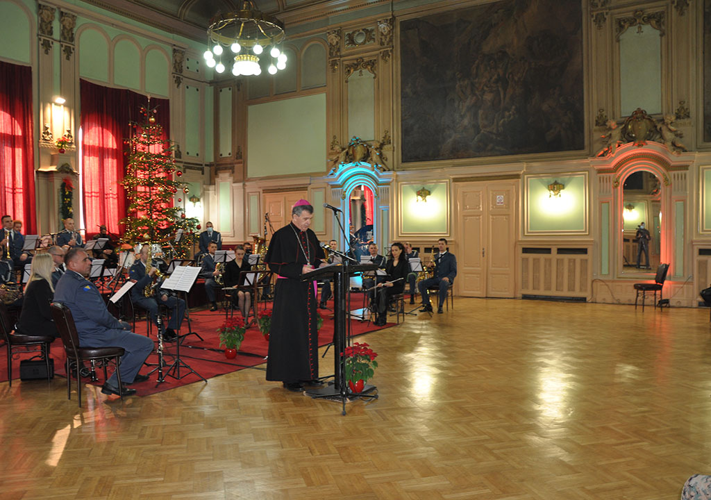 „Ove godine, međutim, svečana dvorana Doma Oružanih snaga je, nažalost, prazna. Nema u njoj gostiju a razlog nam je svima poznat. To jest pandemija i naša stvarna briga za zdravlje ljudi obvezuju na odgovorno ponašanje. Zato smo odlučili prirediti koncert i ponuditi televizijskim i drugim medijskim kućama da ga snime te u svom programu ponude kao znak naše blizine svim ljudima, a posebice onima koji trpe zbog bolesti“, kazao je mons. Vukšić, pozdravljajući, u ovim novim okolnostima, Vojini orkestar OS BiH, izvođače, predstavnike Ministarstva obrane i Oružanih snaga te gledatelje i slušatelje. Uz to, mons. Vukšić izrekao je božićnu želju, prikladnu, kako je naglasio, vremenu i okolnostima.