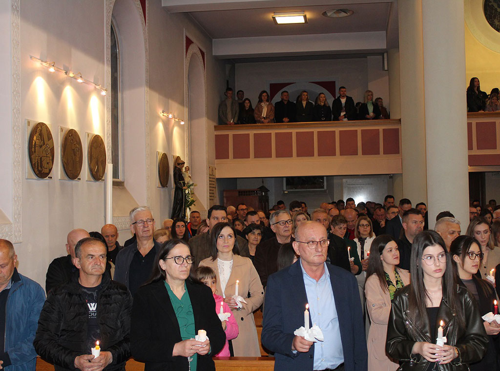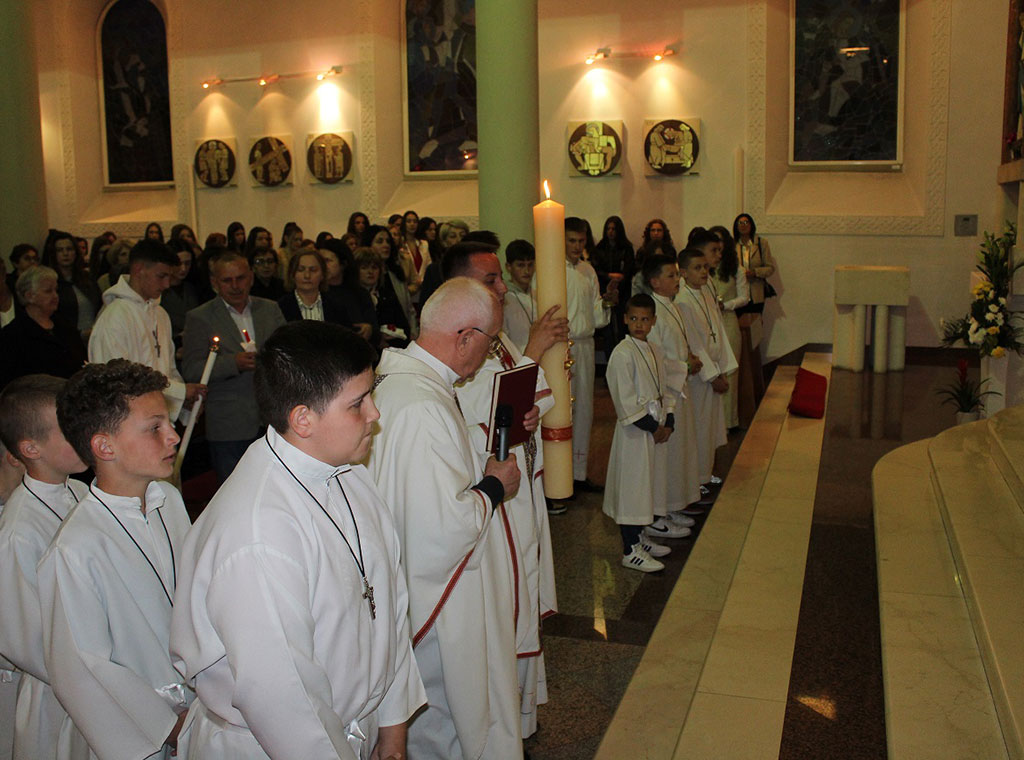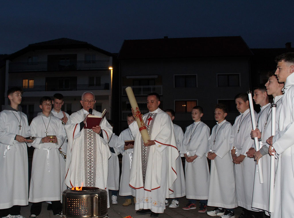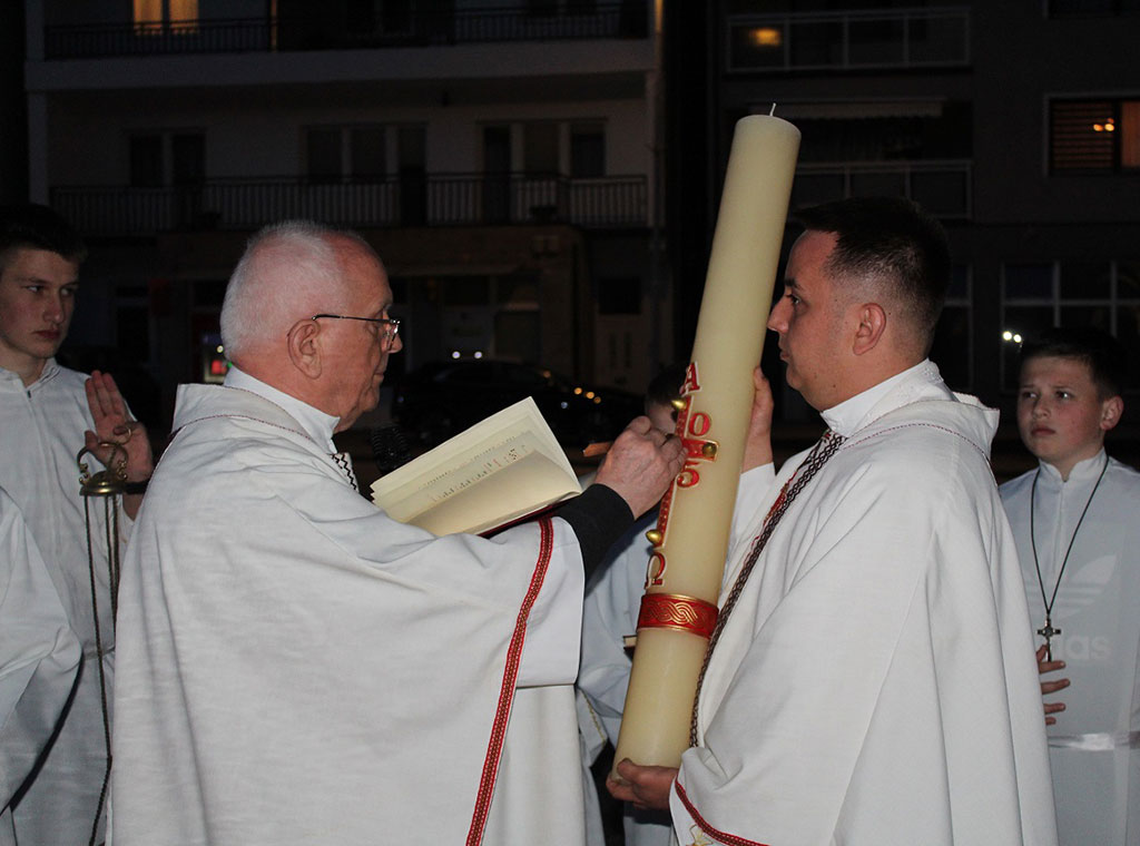 Slavlje je započelo Službom svjetla ispred župne crkve, tijekom koje je župnik blagoslovio oganj i veliku uskrsnu svijeću koju je u crkvu svečano unio vlč. Mijać. Hvalospjev uskrsnoj svijeći izveo je zatim mons. Tomić.