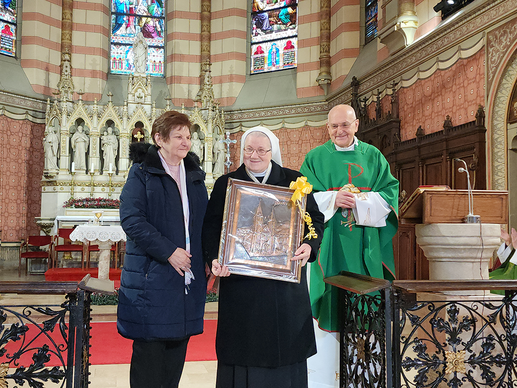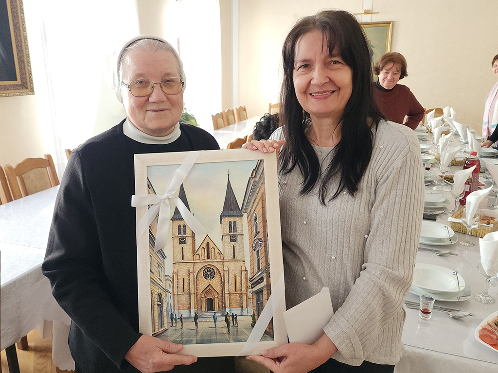 Dugogodišnja članica katedralnog župnog zbora Tonka Bošnjak predala je sestri Petronili bakrorez katedrale Presvetog Srca Isusova kao zahvalu i sjećanje na njezino osmogodišnje djelovanje u sarajevskoj prvostolnici. Druženje je nastavljeno u prostorijama župne kuće.