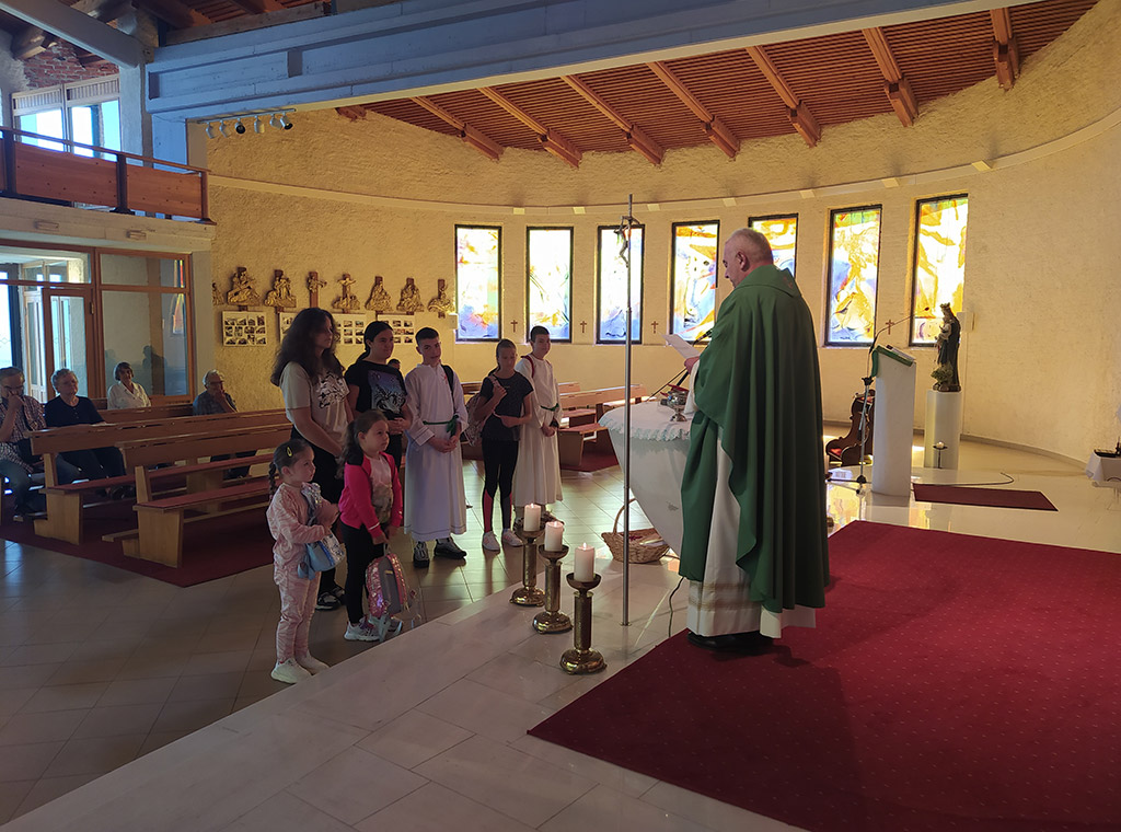 Na kraju misnog slavlja, držeći svoje školske torbe, okupili su se oko oltara. Zazivajući Božji blagoslov na djecu, koja će krenuti u još jednu novu avanturu, u novu školsku i vjeronaučnu godinu, župnik im je naglasio da ne zaborave Boga staviti na prvo mjesto, s Bogom uvijek računati i s njim koračati.