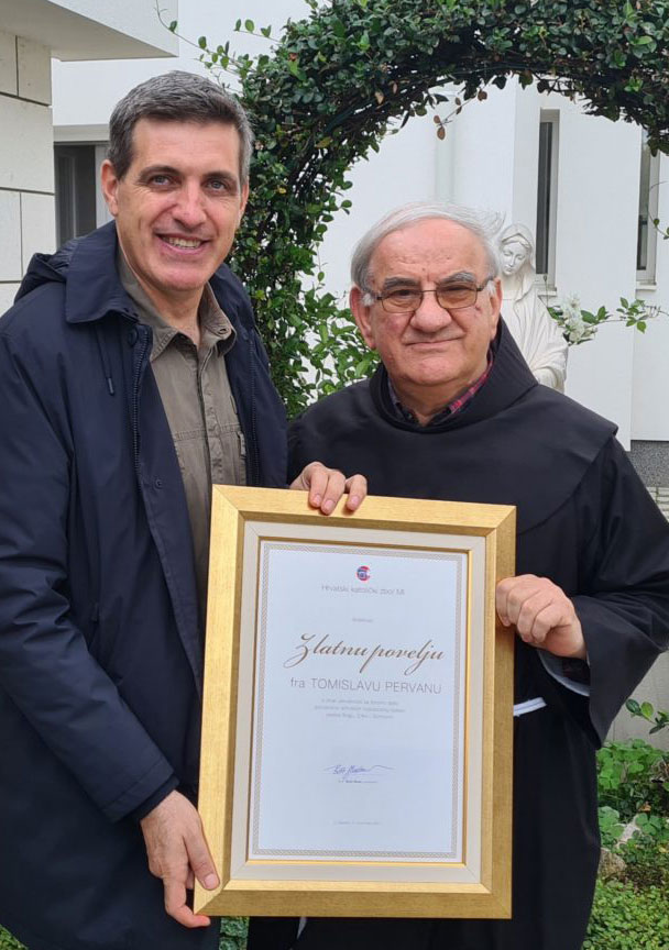 Hrvatski katolički zbor MI dodijelio je Zlatnu povelju dr. fra Tomislavu Pervanu u znak zahvalnosti za životno djelo posvećeno istinskom svjedočenju ljubavi prema Bogu, Crkvi i Domovini.