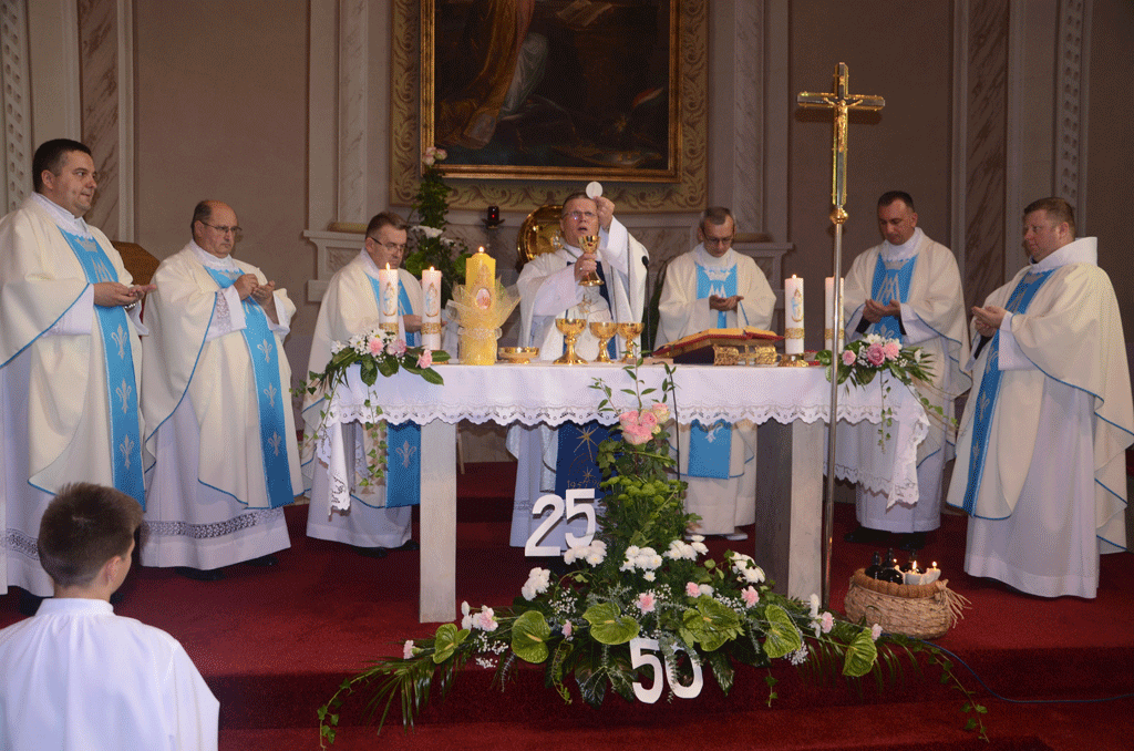 Pozdravnu riječ uputio je na početku mise župnik Ivan Lenić te posebno čestitao jubilarkama njihove zlatne i srebrene jubileje. Svečano euharistijsko slavlje u župnoj crkvi krštenja sluge Božjega Josipa Stadlera, posvećenoj Gospi Brze Pomoći, uz domaćeg župnika i dekana Ivana Lenića te petoricu domaćih svećenika, predvodio je đakovačko-osječki nadbiskup mons. Đuro Hranić.
