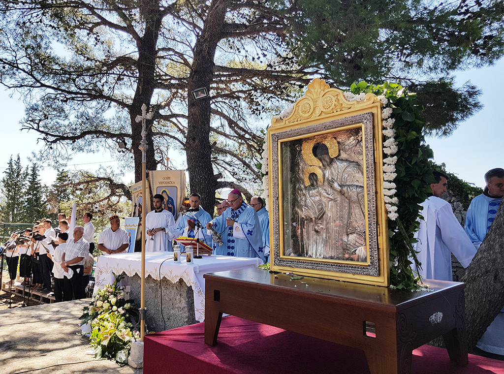 U propovijedi je podsjetio na stoljetnu povijest ovoga svetišta od prve crkvice Stomorije pa do čašćenja Gospine slike s kraja XIV. stoljeća pred kojom pristigli Marijini romari/hodočasnici - izbliza i daleka - vape i zahvaljuju za uslišane molitve. "Gospa nas okuplja oko svoga Sina, k njemu nas vodi da poput nje poslušamo njezina Sina u svemu što nam govori", kazao je biskup Tomislav te na temelju svetopisamskih čitanja progovorio o Gospi - Ženi suncem odjevenoj. Potom je ocrtao život u ovoj ljudskoj "suznoj dolini" koji ima različitih strahova i izazova.