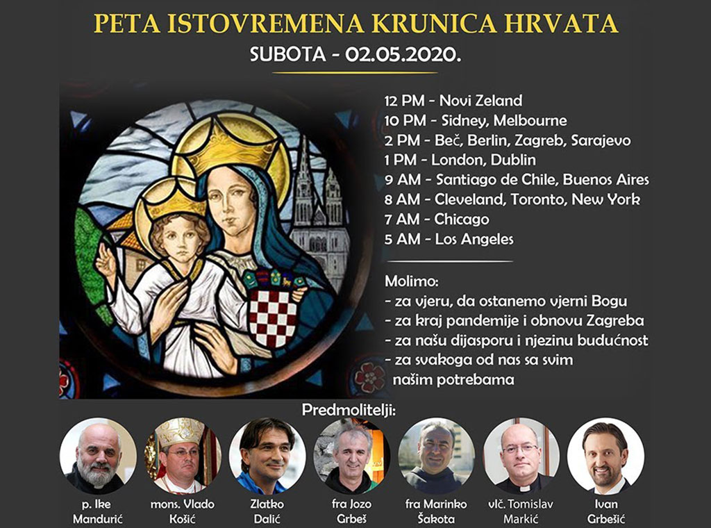 Hrvati danas u 14 sati, po hrvatskom vremenu, mole za suzbijanje pandemije koronavirusa, za obnovu Zagreba, za raseljeni narod te za obnovu vjere.