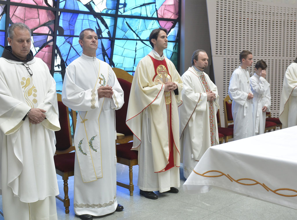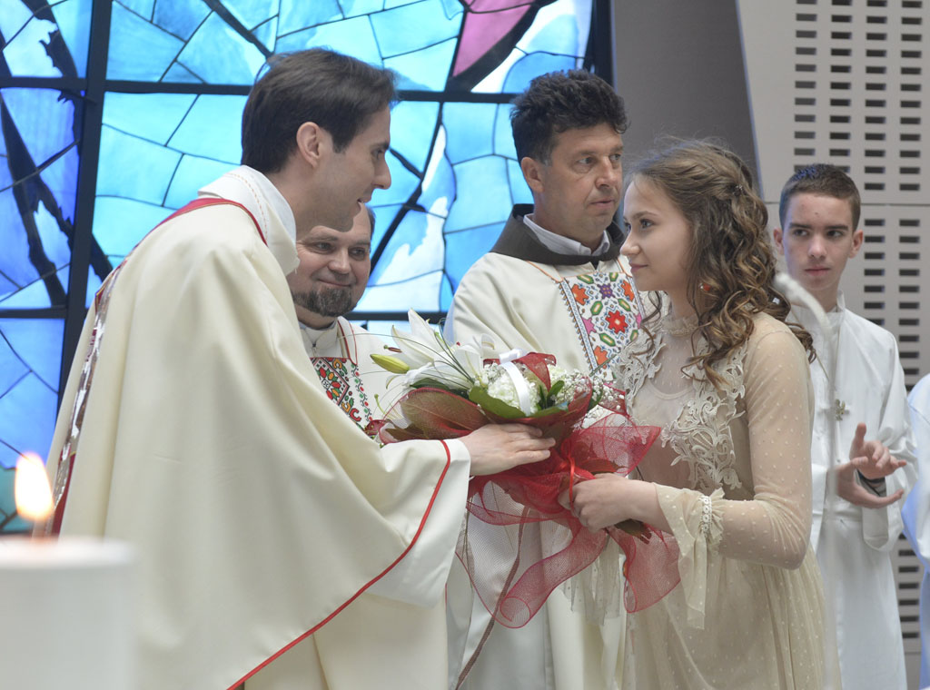 Na početku misnog slavlja, nakon otpjevane himne Duhu Svetomu pozdrave riječi dobrodošlice u ime okupljenih župljana vjernika, krizmanika, njihovih roditelja i kumova krizmatelju preč. Kovaču uputili su krizmanici Luka Glavendekić i Mirta Lovrić.