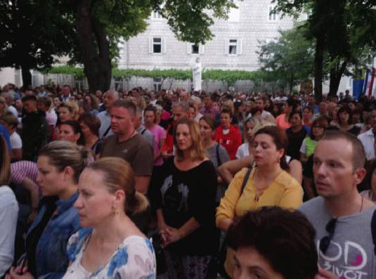 Pozdravivši svećenike i sve hodočasnike, nadbiskup Barišić je izrazio radost što vidi toliko mladih koji hodočaste Gospi i uzdaju se u njezin zagovor. Govoreći o ovom hodočašću naglasio je da je ono uistinu vjerničko te je progovorio o važnosti vjere u životu svakoga vjernika. Naglasio je da je vjera svjetlo u tami noći i života, ona nam daje mogućnost i snagu da možemo ići naprijed.