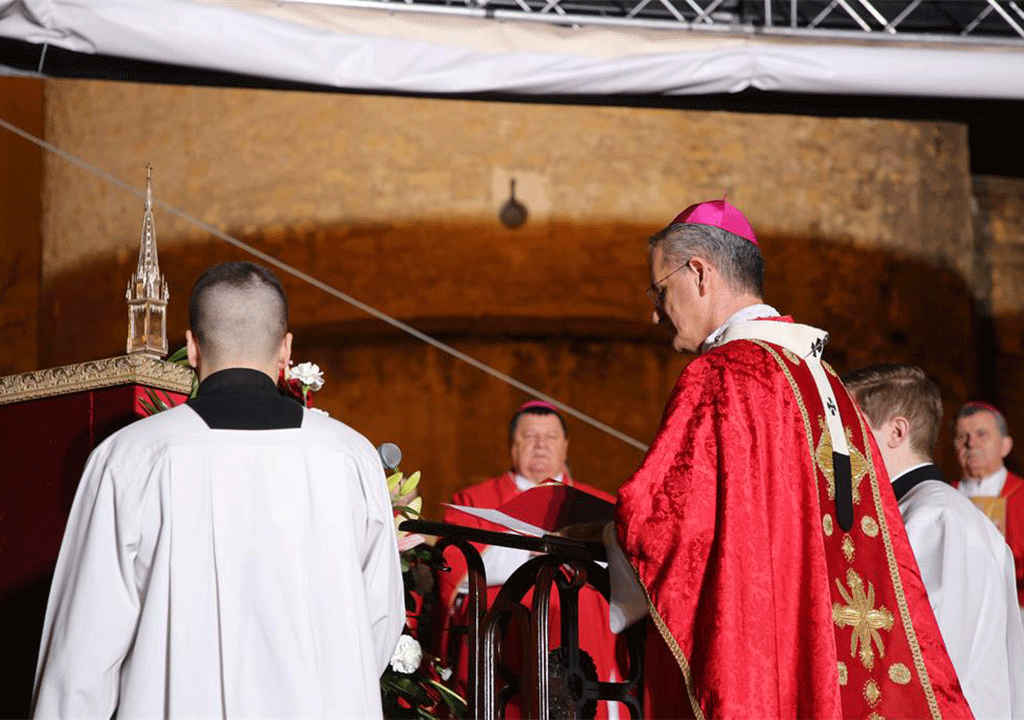 Na početku misnoga slavlja nadbiskup Kutleša pozdravio je sve okupljene rekavši „da smo se večeras okupili na Trgu ispred ranjene zagrebačke katedrale kako bismo dublje uronili u duhovnu baštinu koju nam je predao Blaženi Alojzije Stepinac. Dodao je kako je „Blaženi Alojzije za nas čvrsto uporište, svjetionik vjere i hrabrosti. Njemu danas upravljamo svoj pogled i svoje molitve kako bismo njegovim primjerom nadahnuti crpili inspiraciju, snagu i utjehu za svoje živote. Njegovo svjedočanstvo poziv je svima nama da živimo svoju vjeru s dubokim uvjerenjem i neustrašivo se suočavamo s izazovima svijeta koji nas okružuju.“