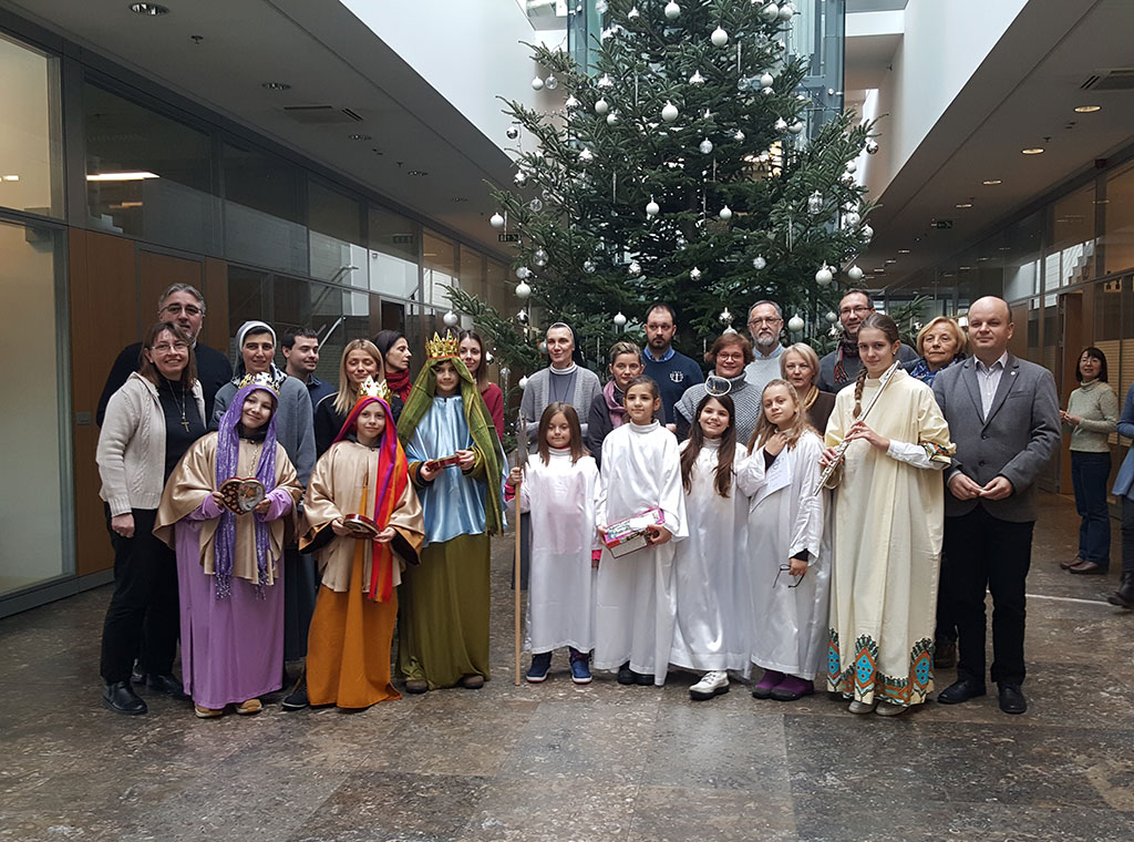 Potom su bili u sjedištu Hrvatske biskupske konferencije (HBK), gdje su djeca u kostimima kraljeva, pastira i anđela svirala i pjevala božićne pjesme. Dočekali su ih don Šimun Šindija, ekonom HBK-a, mons. Fabijan Svalina, ravnatelj Hrvatske katoličke mreže (HKM) i ravnatelj Hrvatskog Caritasa, a tu su bili i zaposlenici ureda i ustanova HBK-a i HKM-a zajedno sa Sinišom Kovačićem, urednikom HKM-a te vlč. Antun Štefan, nacionalni ravnatelj PMD-a u RH.