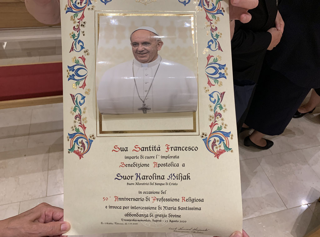 Nakon homilije čestitku pape Franje pročitala je regionalna poglavarica Družbe sestara Klanjateljica Krvi Kristove s. Zdravka Leutar te također uputila čestitke.