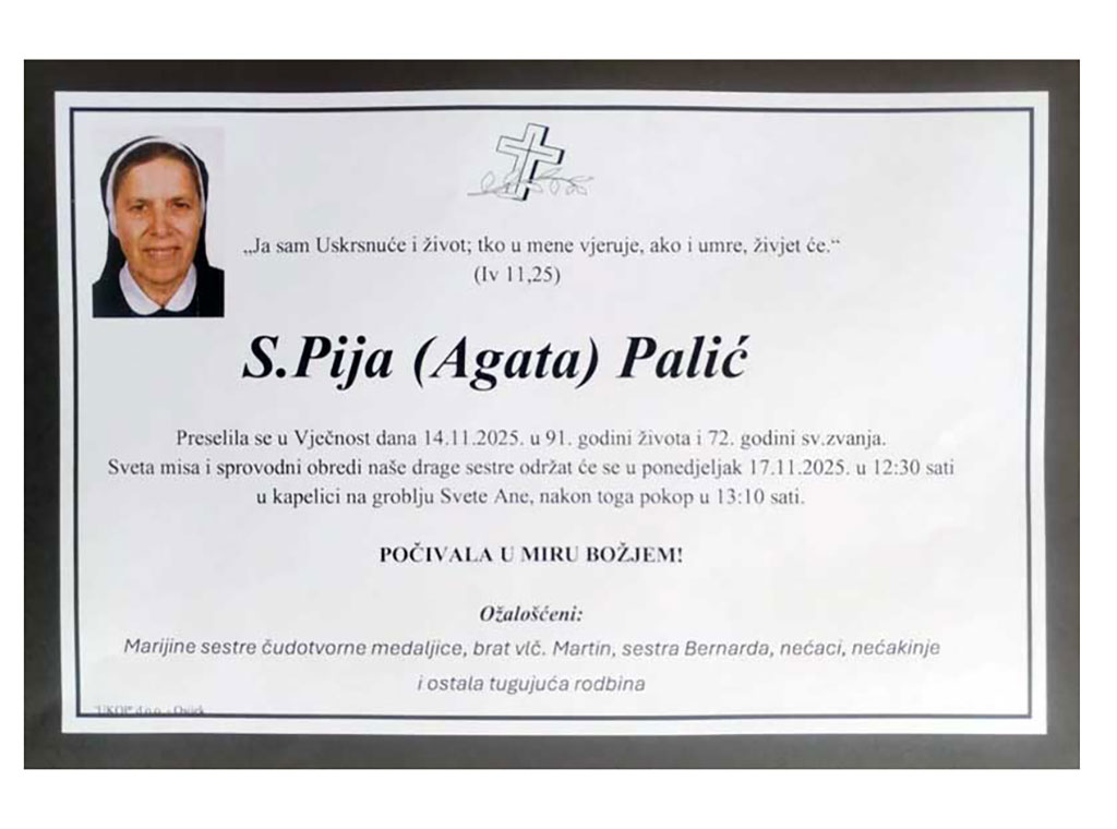 Redovnica Družbe Marijinih sestara čudotvorne medaljice, s. Pija (Agata) Palić, okrijepljena svetim sakramentima, preminula je u Provincijalnoj kući u Osijeku, u petak, 14. studenog u 91. godini života i 72. godini redovništva.