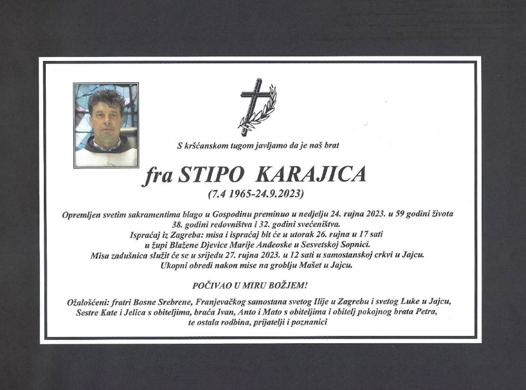 U Kliničkom centru Dubrava u Zagrebu, 24. rujna preminuo je fra Stipo Karajica, svećenik franjevac Bosne Srebrene.