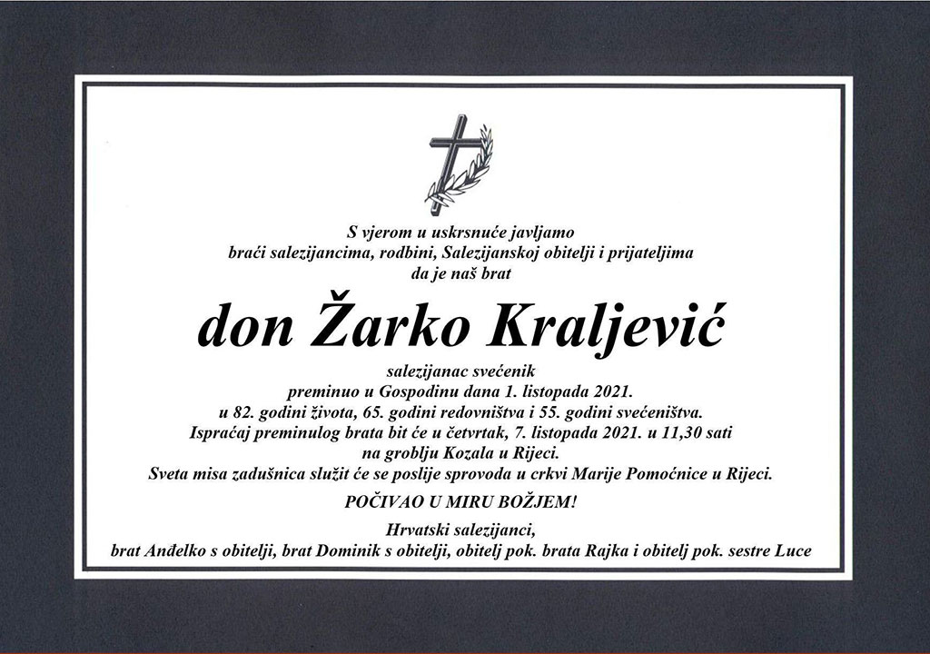 U Rijeci je 1. listopada u 82. godini života, 65. godini redovništva i 55. godini svećeništva umro salezijanac svećenik don Žarko Kraljević.
