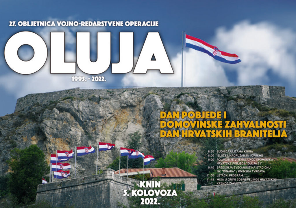 U Kninu će 5. kolovoza biti središnja proslava Dana pobjede i domovinske zahvalnosti, Dana hrvatskih branitelja i 27. obljetnice vojno-redarstvene operacije „Oluja“. Vojni ordinarijat u Republici Hrvatskoj proslavit će svetkovinu nebeske zaštitnice Gospe Velikog Hrvatskog Krsnog Zavjeta.