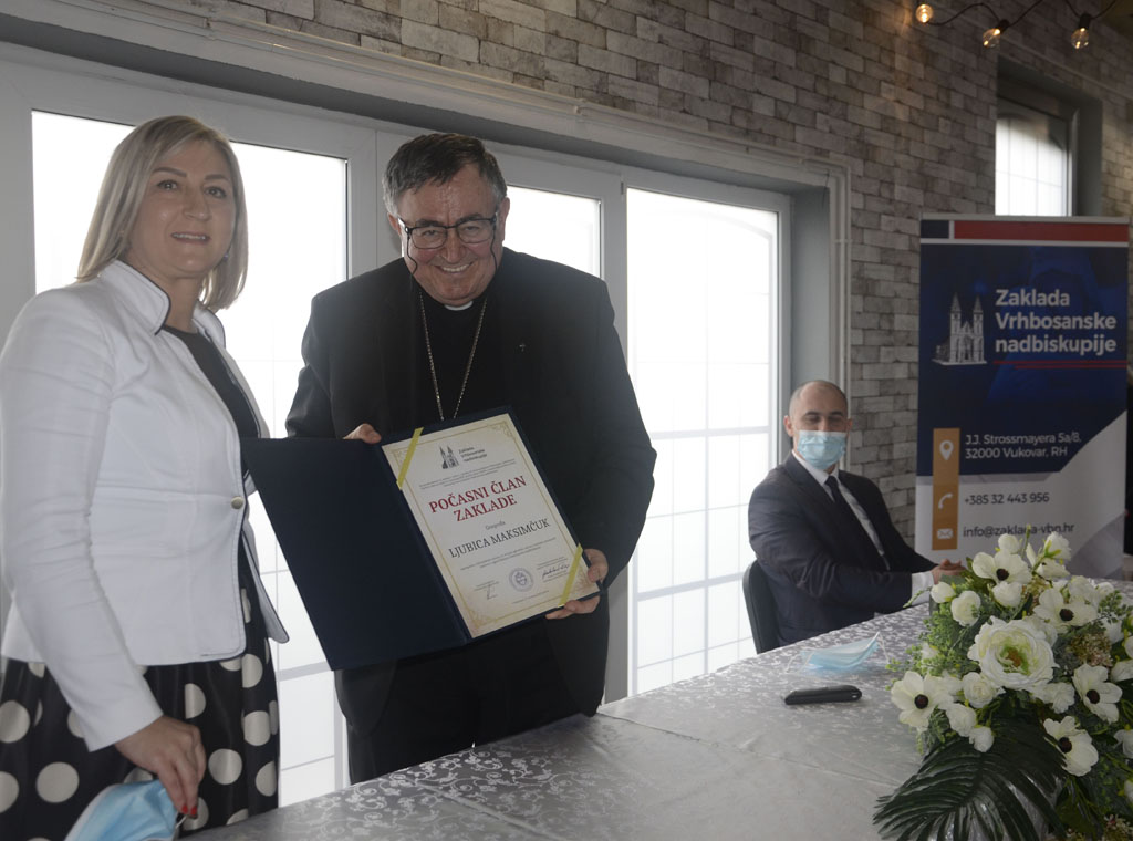 Kardinal je svakom podupiratelju u ime Zaklade uručio zahvalnice, a Ljubici Maksimčuk i povelju počasnog člana. Zahvalu za pomoć u Zakladi kardinal je uručio i vlasnici sale Dika Blaženki Aničić-Dikanović.
