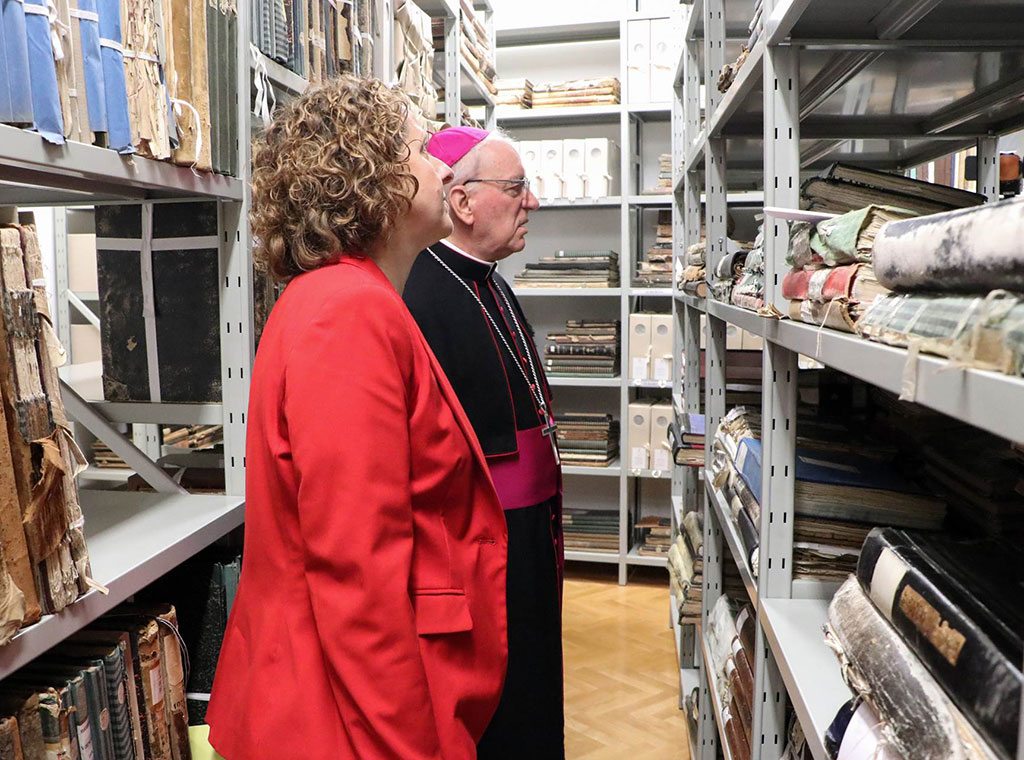 Ministrica Obuljen Koržinek zahvalila je biskupu Antunu i Požeškoj biskupiji za upornost u nastojanju oko povrata oduzetih crkvenih knjiga. Istaknula kako je posebno povjerenstvo Ministarstva kulture i medija provjerilo jesu li uvjeti koje ima Požeška biskupija prikladni za njihov smještaj. Pohvalila je Požešku biskupiju što se pobrinula da ti uvjeti budu primjerni, te se crkvene knjige smjeste onamo gdje i pripadaju i tako ispravi nanesena nepravda prema Katoličkoj Crkvi u vrijeme komunističke vladavine. Biskup Antun i ministrica Obuljen Koržinek sa suradnicima razgovarali su o nekim pitanjima suradnje između Ministarstva i Požeške biskupije na određenim kulturnim projektima, dok su se ravnatelji državnih arhiva zadržali na kratkom druženju u prostorima Biskupskog ordinarijata. Biskup je darovao ministrici grafiku Krista u grobu akademika Đure Sedera, izrađenu prigodom 25. obljetnice Požeške biskupije te monografiju Požeška katedrala, koja je u izdanju Požeške biskupije, Instituta za povijest umjetnosti u Zagrebu i ArTresora u Zagreba tiskana spomenutom prigodom. Ministrica je pak darovala biskupu knjigu Vječne vode: život i ljepota – hrvatski udio u europskoj baštini.
