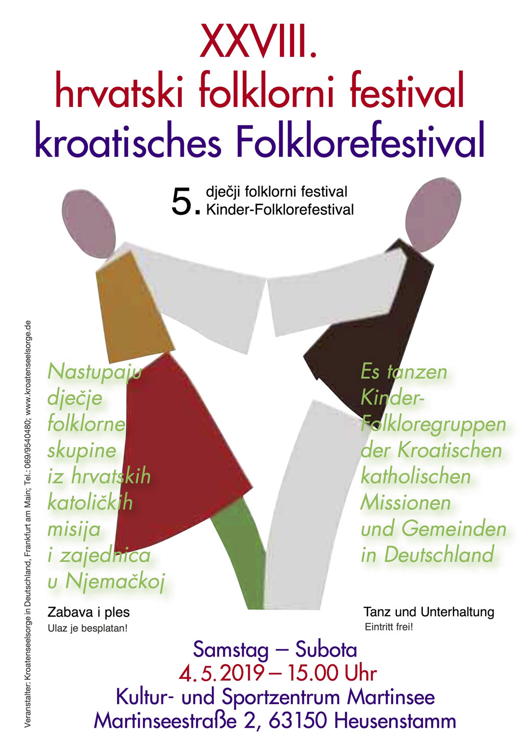 Tradicionalni, 28. hrvatski folklorni festival s 5. dječjim hrvatskim foklornim festivalom, održat će se u subotu 4. svibnja u Kultur- und Sportzentrum „Martinsee“ u Heusenstammu kod Offenbacha na Majni.