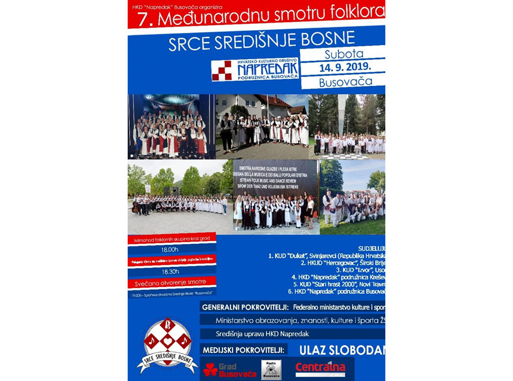 U subotu 14. rujna s početkom u 18 sati bit će održana 7. Međunarodna smotra folklora „Srce Središnje Bosne“ koju organizira HKD „Napredak“ – podružnica Busovača.