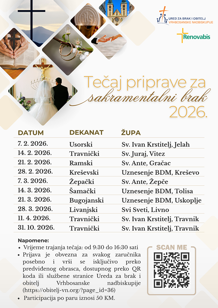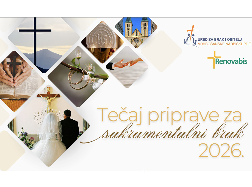 Ured za brak i obitelj, u suradnji s Centrom za savjetovanje Vrhbosanske nadbiskupije, organizira i u 2026. ciklus tečajeva priprave za sakramentalni brak po raznim dekanatima Vrhbosanske nadbiskupije.