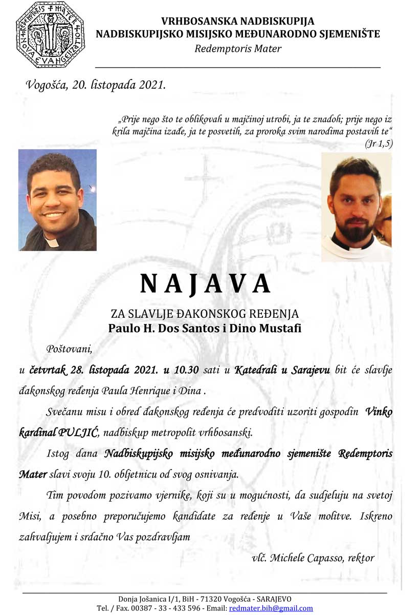 U četvrtak, 28. listopada, u 10.30 sati u katedrali Srca Isusova u Sarajevu za đakone će biti zaređni dvojica kandidata Nadbiskupijskog misijskog međunarodnog sjemeništa Redemptoris Mater u Vogošći Paulo H. Dos Santos i Dino Mustafi.