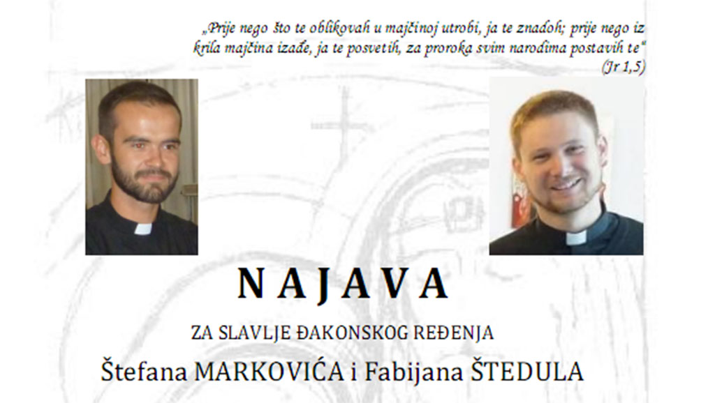 U nedjelju, 28. listopada u 10.30 sati u sarajevskoj katedrali Srca Isusova bit će slavlje đakonskog ređenja Štefana Markovića i Fabijana Štedula.