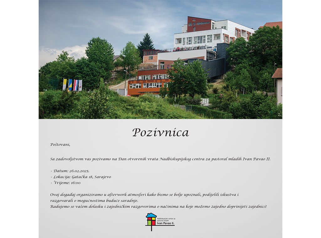 Nadbiskupijski centar za pastoral mladih „Ivan Pavao II.“ (Sarajevo, Gatačka 18) poziva na Dan otvorenih vrata u srijedu, 26. veljače s početkom u 16 sati.