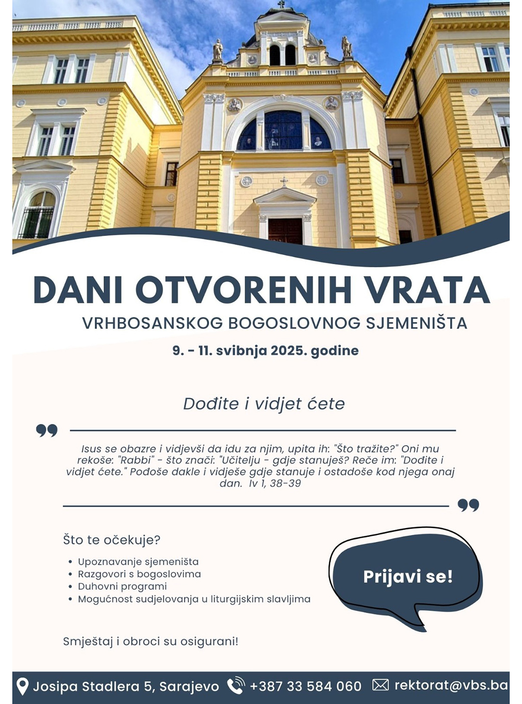Nakon dva održana susreta, za Vrhbosansku nadbiskupiju u župi Presvetoga Trojstva u Novom Travniku, te za hercegovačke biskupije u župi Gospe od zdravlja – Neum, Vrhbosansko bogoslovno sjemenište organizira Dane otvorenih vrata za mladiće koji razlučuju životni poziv i razmišljaju o svećeničkom zvanju i formaciji.