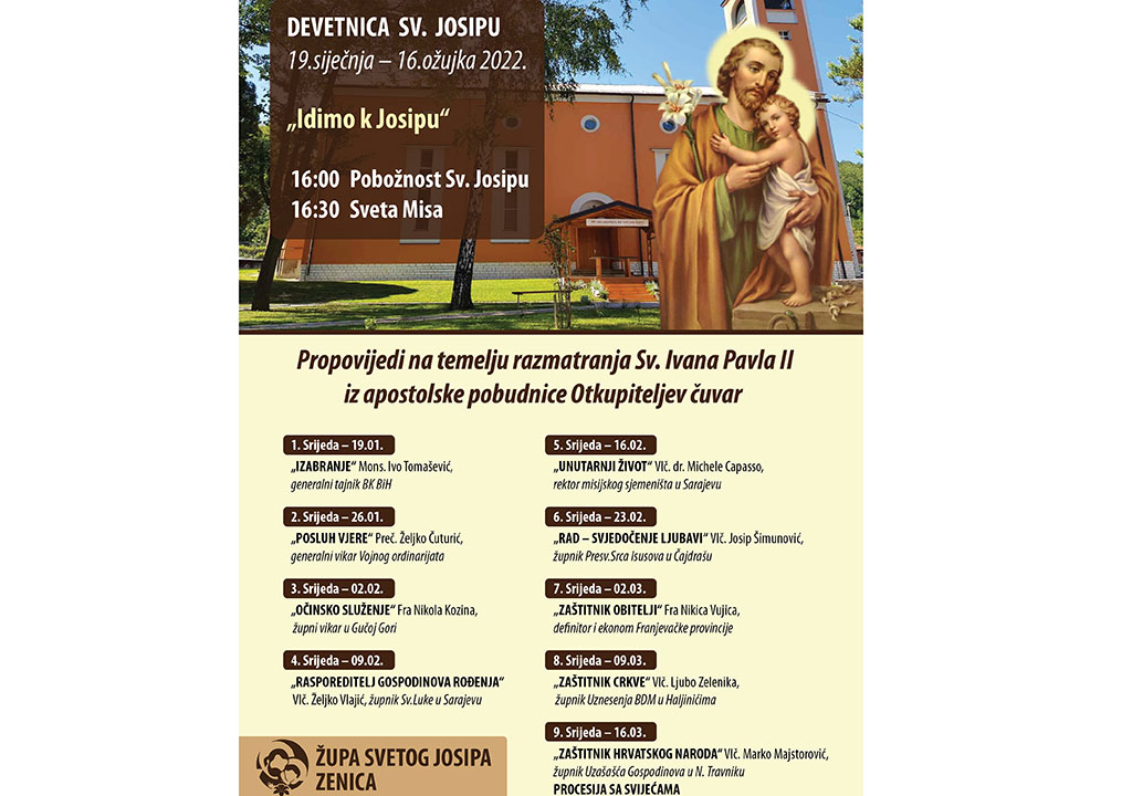 Župa Sv. Josipa u Zenici u srijedu 19. siječnja započinje Devetnicu „Idimo k Josipu“ u čast Sv. Josipu kroz devet srijeda i proslavi patrona župe.