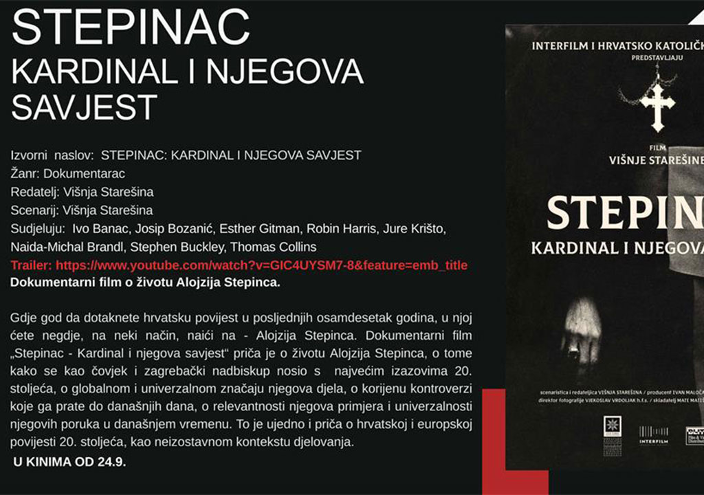 Dokumentarni film „Stepinac – Kardinal i njegova savjest“ scenaristice i redateljice Višnje Starešina počinje s prikazivanjem od 24. rujna u kinima diljem Hrvatske, objavljeno je na mrežnim stranicama Zagrebačke nadbiskupije.