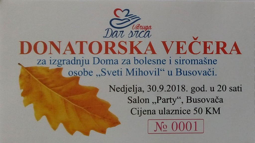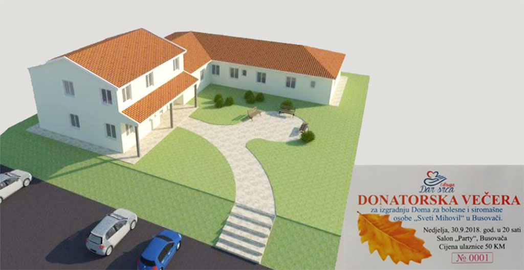 „Ova donatorska večer prigoda je da se pomogne izgradnja Doma za siromašne Sv. Mihovil u Busovači. Bit će to dom koji će koristiti našem narodu, našim starim i siromašnim osobama odnosno svima onima u potrebi. Uz to, ova večera svojevrsna je zahvala svima onima koji su već pomogli gradnju doma“, poručili su iz udruge Dar srca koja u Busovači kroz razne aktivnosti i volonterski djeluje već 13 godina na dobrobit potrebitih i zajednice.