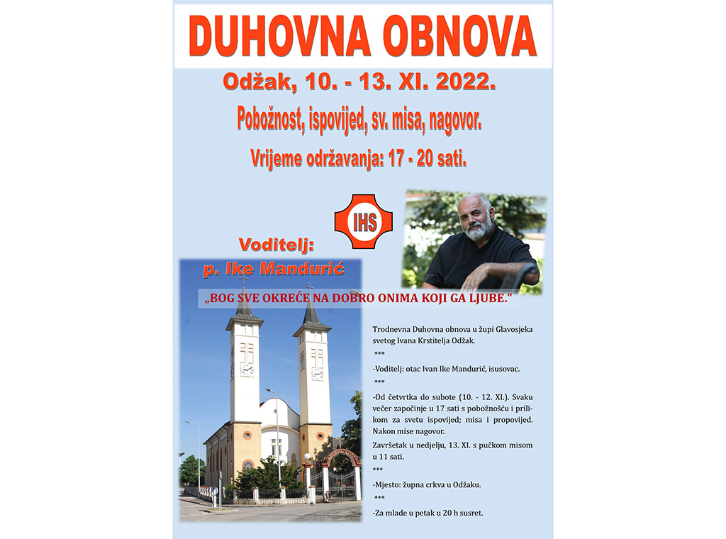 Župa glavosjeka Sv. Ivana Krstitelja u Odžaku domaćin je duhovne obnove koju će predvoditi p. Ivan Ike Mandurić, a koja će se održati od 10. do 13. studenoga.