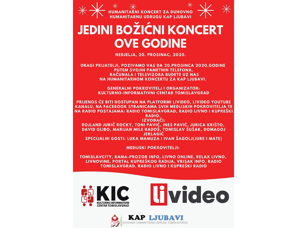 U nedjelju, 20. prosinca preko nekoliko online platformi bit će omogućeno praćenje online humanitarnog koncerta za duhovno humanitarnu Udrugu Kap ljubavi.