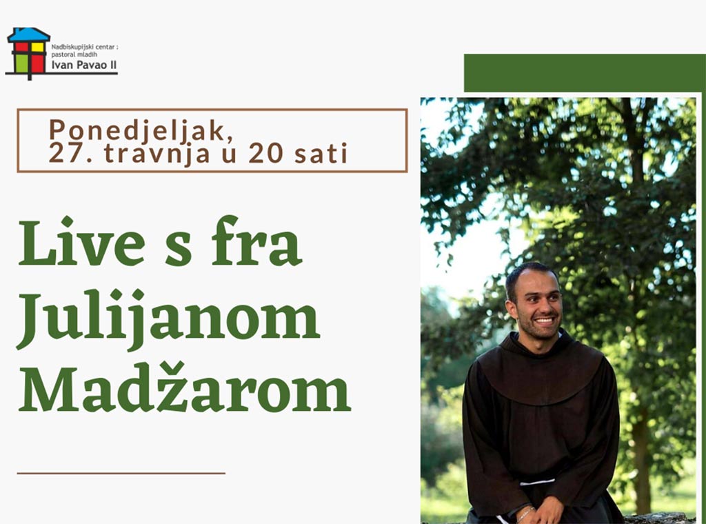 Nakon uspješnog live druženja s don Danijelom Vidovićem, fr. Ivanom Dominikom Iličićem, don Damirom Stojićem koje je pratilo više od 1 000 mladih, te fra Ivanom M. Lotatrom i pravoslavnim svećenikom Mladenom Drobnjakom, u ponedjeljak 27. travnja u 20 sati na Instagram profilu djelatnici Centra za mlade ugostit će još jednog zanimljivog svećenika, fra Julijana Madžara.