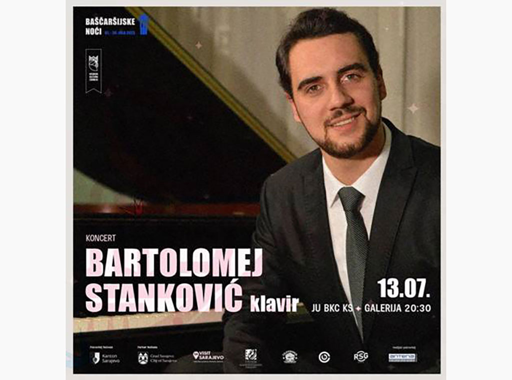 U sklopu manifestacije Baščaršijske noći, koncert „Biseri bosanskohercegovačke klavirske glazbe“, u četvrtak 13. srpnja s početkom u 20:30h u BKC-u, održat će pijanist Bartolomej Stanković, van. prof. na Katedri za klavir Muzičke akademije Univerziteta u Istočnom Sarajevu.