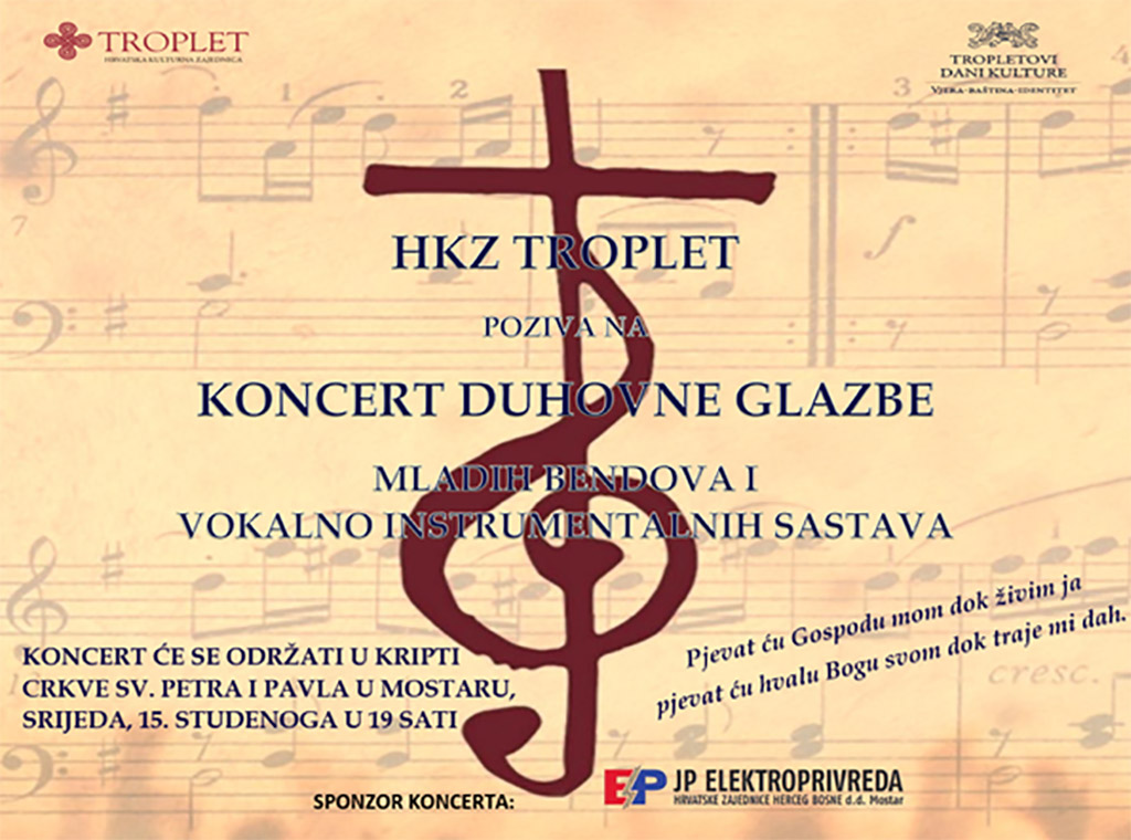 U okviru "Tropletovih dana kulture", u srijedu 15. studenoga u 19 sati, u kripti župne crkve Sv. Petra i Pavla u Mostaru, održat će se koncert duhovne glazbe.