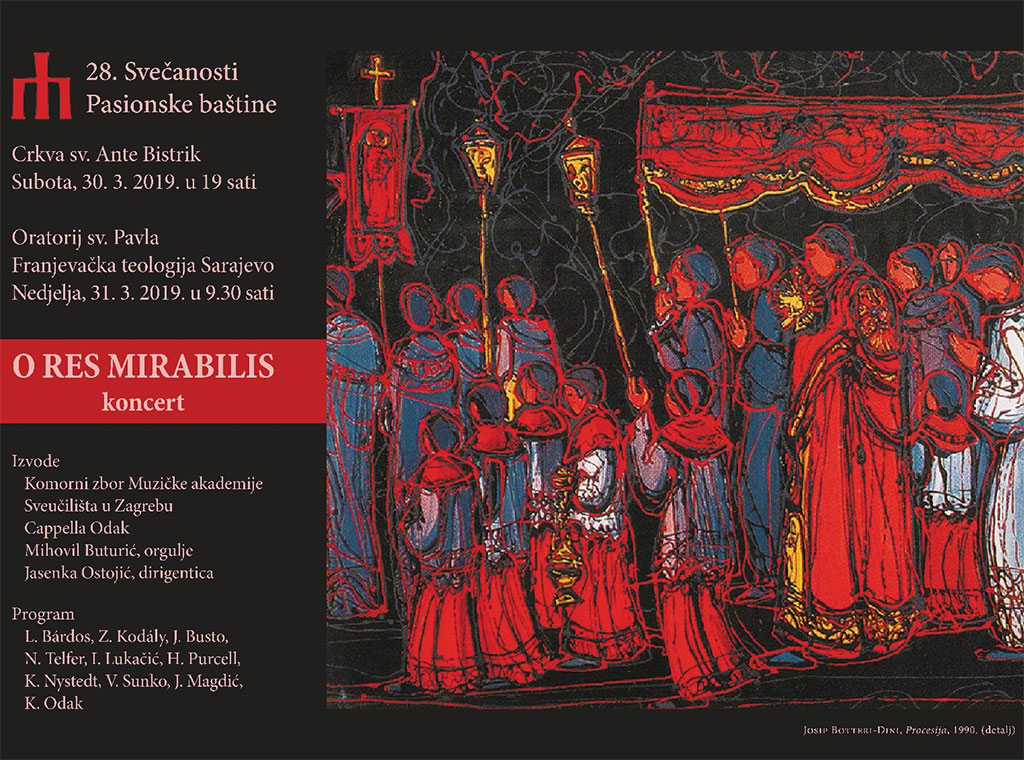 U suradnji s Organizacijskim odborom 28. Svečanosti Pasionske baštine u samostanskoj crkvi Sv. Ante na Bistriku u Sarajevu u subotu, 30. ožujka u 19 sati održat će se svečani korizmeni koncert „O res mirabilis“.