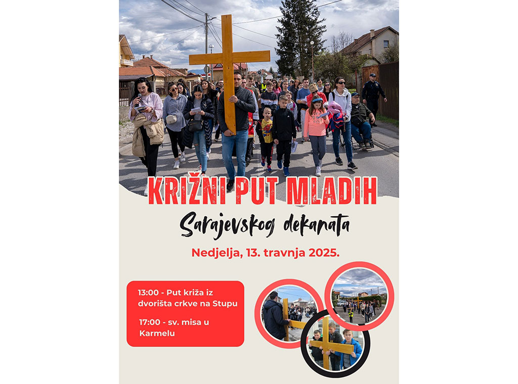 Već tradicionalno, na Cvjetnicu, Nedjelju muke Gospodnje, 13. travnja s početkom u 13 sati bit će organiziran Križni put mladih Sarajevskog dekanata.
