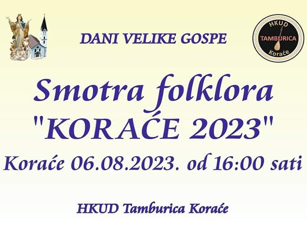 Uz vjersko kulturnu manifestaciju Dani Velike Gospe u nedjelju 6. kolovoza u župi Uznesenja BDM u Koraću, održat će se međunarodna smotra folklora „Koraće 2023“.