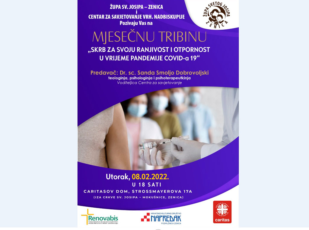 Prva mjesečna tribina bit će u utorak 8. veljače u 18 sati na temu Skrb za svoju ranjivost i otpornost u vrijeme pandemije Covid-a 19 koju će održati voditeljica Centra za savjetovanje Vrhbosanske nadbiskupije dr. Sanda Smoljo Dobrovoljski, teologinja, psihologinja i psihoterapeutkinja.