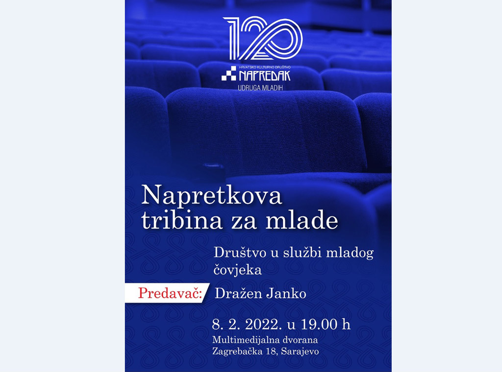 U sklopu proslave 120 godina od osnutka Hrvatskog kulturnog društva Napredak, u organizaciji Udruge Mladih HKD Napredak u utorak 8. veljače u 19,00 sati u multimedijalnoj dvorani Franjevačkog međunarodnog studentskog centra bit će upriličena tribina za mlade na temu Društvo u službi mladog čovjeka.