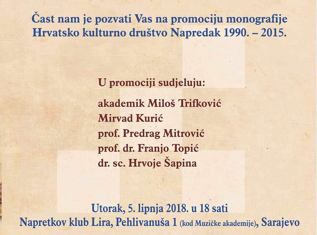 U prigodi obilježavanja 25. obljetnice obnove, HKD „Napredak“ će u utorak, 5. lipnja u 18 sati u Napretkovu klubu „Lira“ upriličiti predstavljanje monografije „HKD Napredak 1990. – 2015.“.