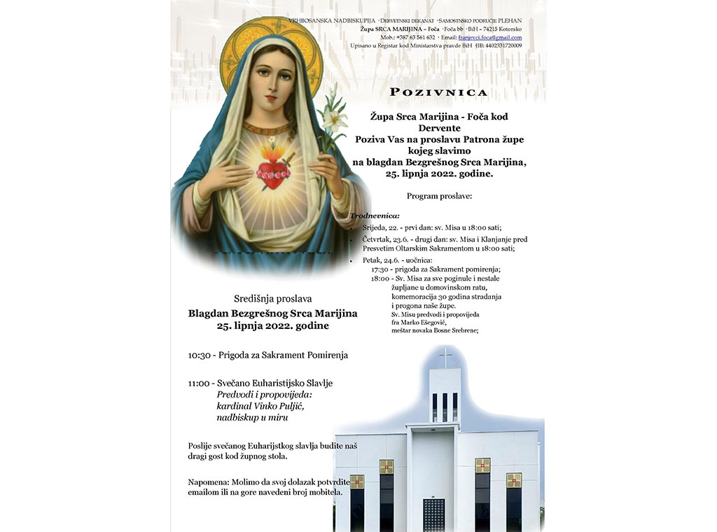 Blagdan Srca Marijina proslavlja kao patron, u subotu 25. lipnja, istoimena župa u Foči kod Dervente, gdje će tim povodom svečano blagdansko slavlje predvoditi Vinko kard. Puljić, vrhbosanski nadbiskup u miru.