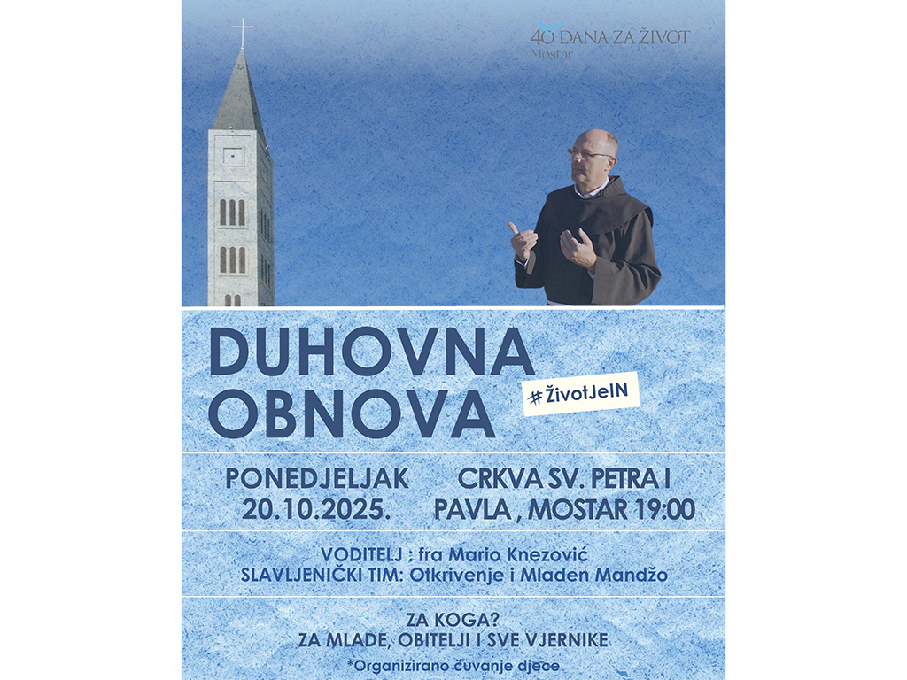 Inicijativa „40 dana za život“ najavljuje prvu duhovnu obnovu u Mostaru, pod nazivom "#ŽivotJeIn", koju će voditi gvardijan i župnik crkve i samostana Sv. Petra i Pavla u Mostaru fra Mario Knezović.