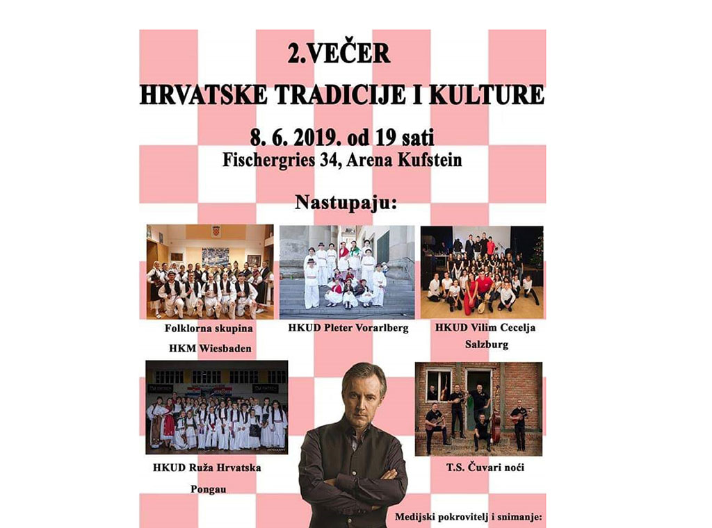 Članovi Kulturno-umjetničkog društva Kufstein iz istoimenoga austrijskog grada organiziraju u subotu 8. lipnja u Areni, Fischergries 34, drugu po redu „Večer hrvatske tradicije i kulture“