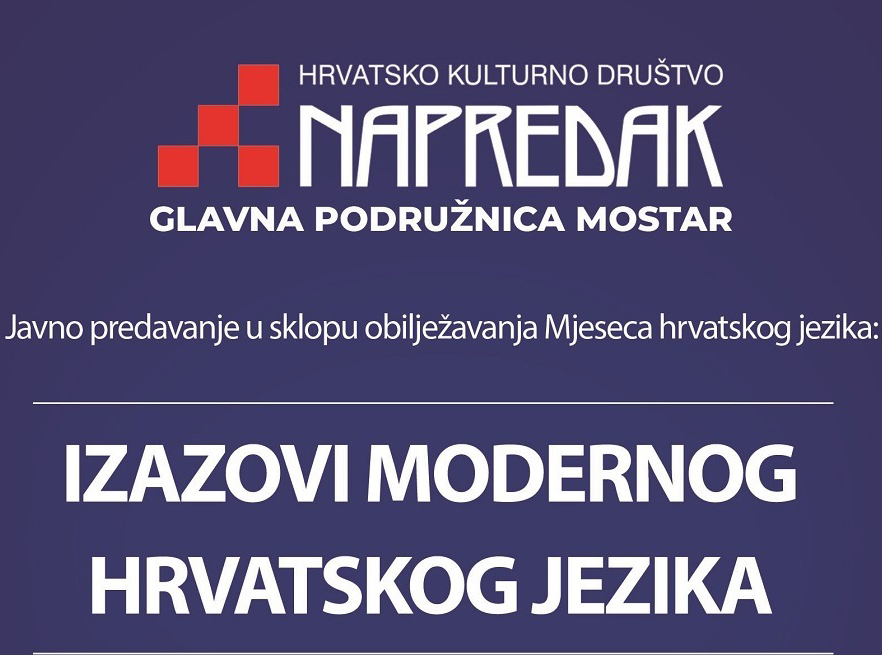 HKD „Napredak“, Glavna podružnica Mostar, organizira Javno predavanje u sklopu obilježavanja Mjeseca hrvatskog jezika pod nazivom „Izazovi modernog hrvatskog jezika”.