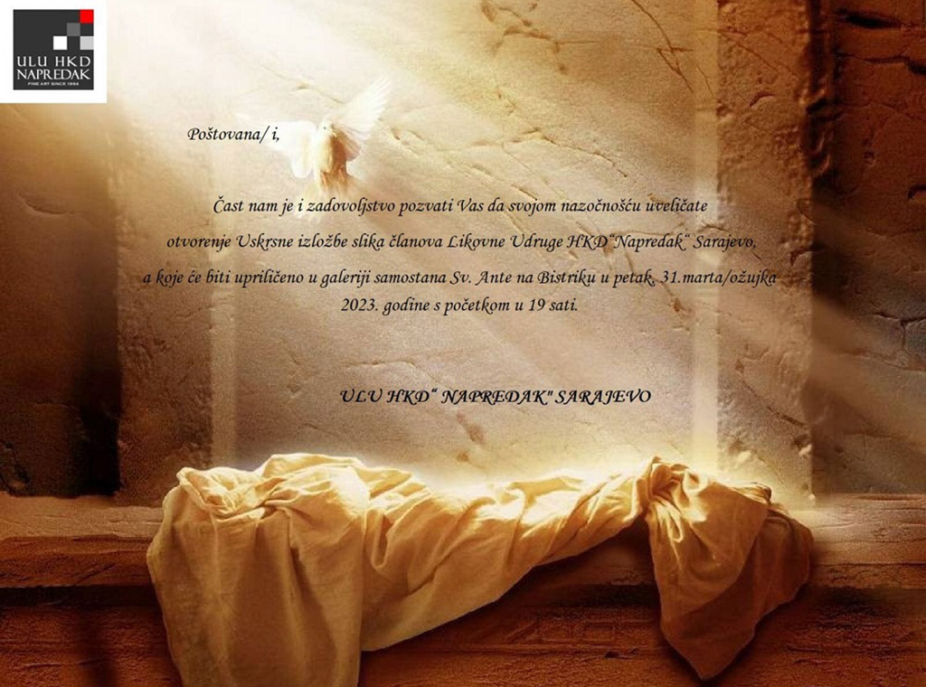 Poštujući tradiciju održavanja uskrsnih programa, Udruga likovnih umjetnika HKD "Napredak" u povodu najvećeg kršćanskog blagdana Uskrsa, upriličit će u petak, 31. ožujka u 19,00 sati u Maloj galeriji samostana Sv. Ante na Bistriku "Uskrsnu izložbu".